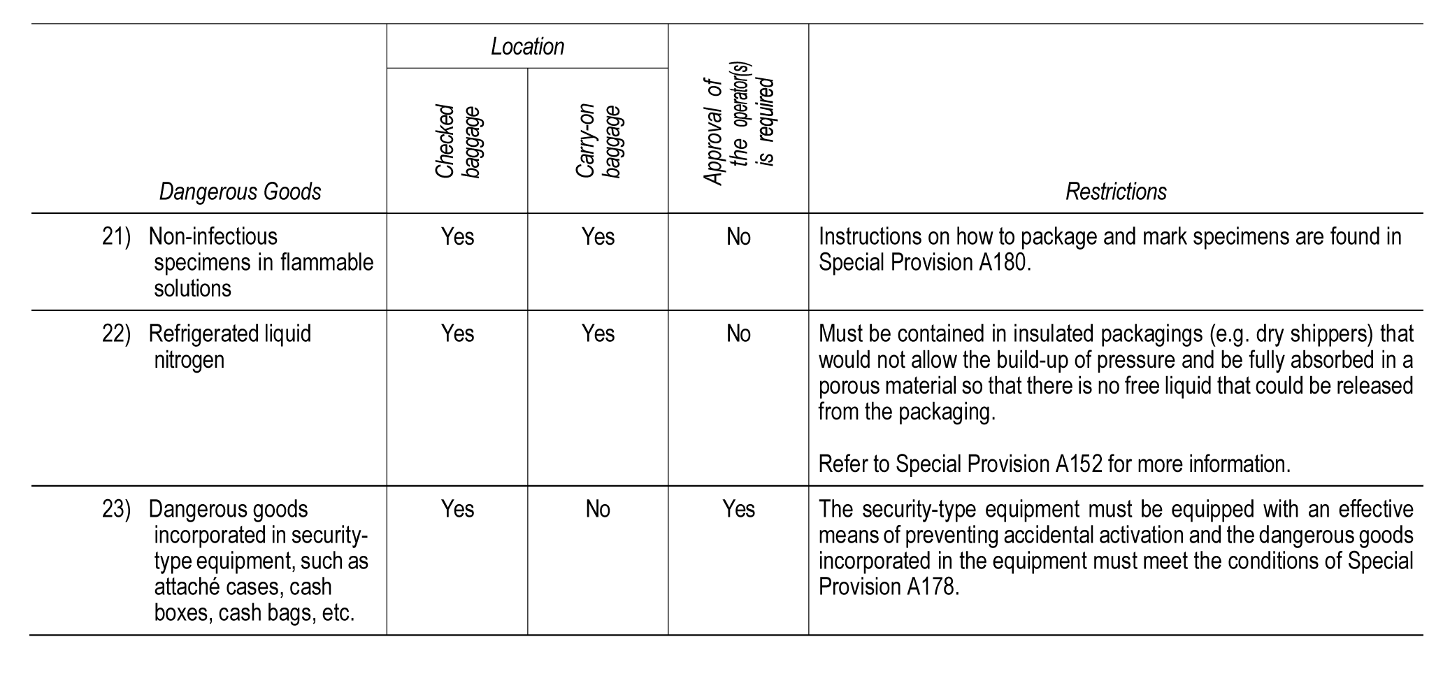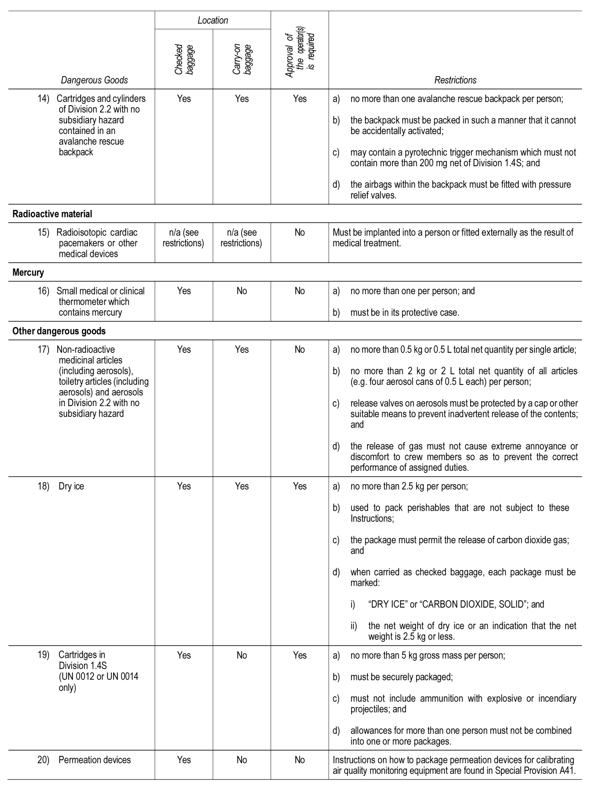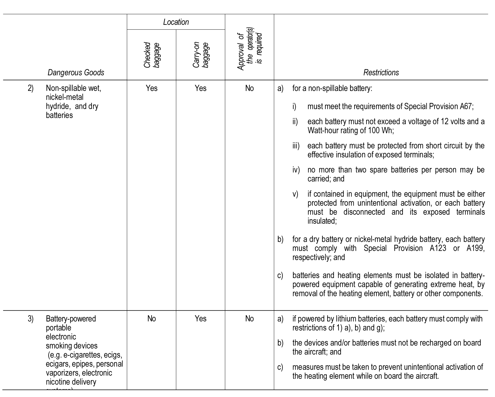 Notwithstanding any additional restrictions that may be implemented by States in the interests of aviation security, passengers or crew are forbidden to carry dangerous goods, either as or in carry-on baggage, checked baggage or on their person, unless the dangerous goods are permitted in accordance with Table 1. “Provisions for DG carried by passengers or crew” and: