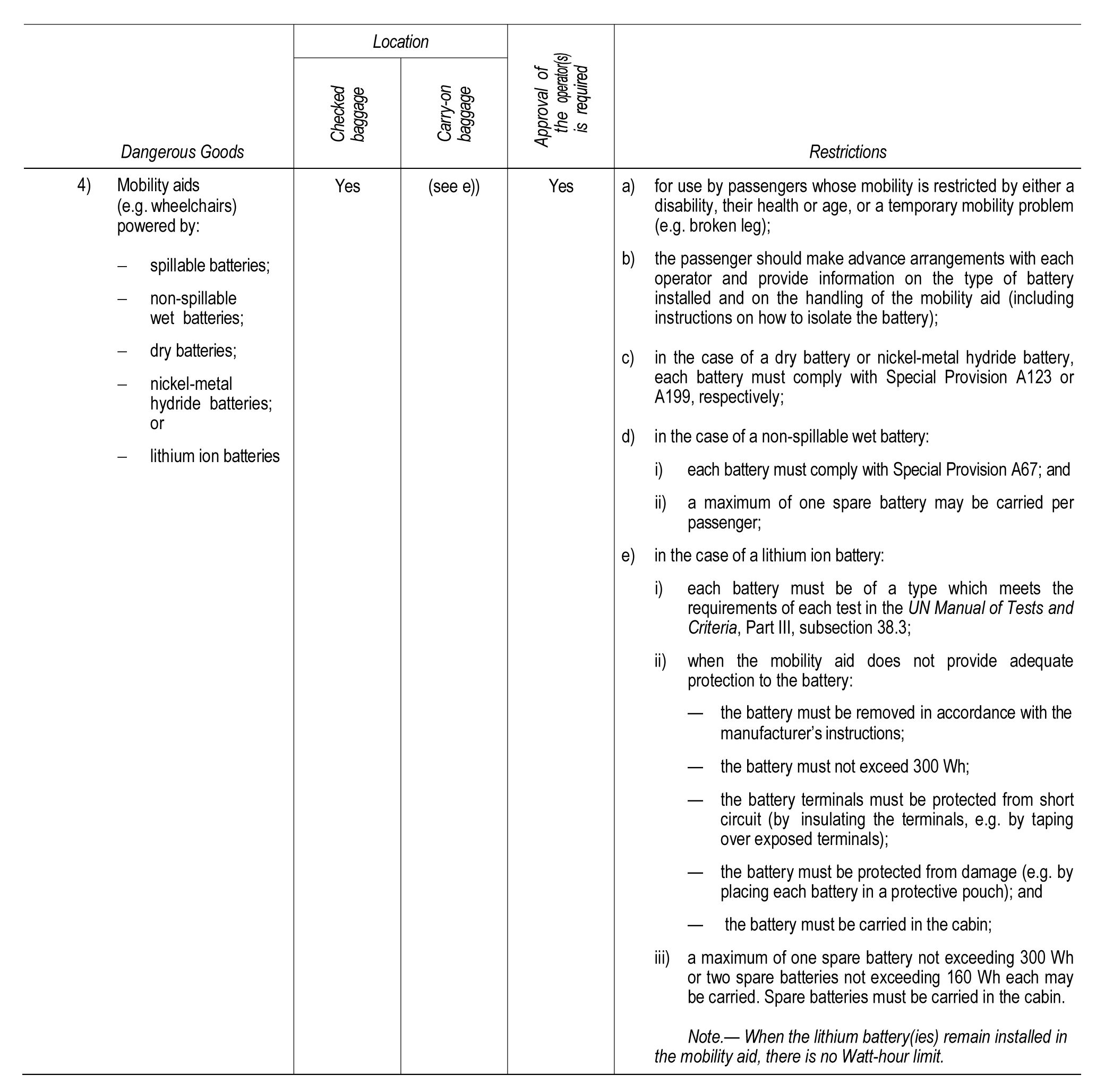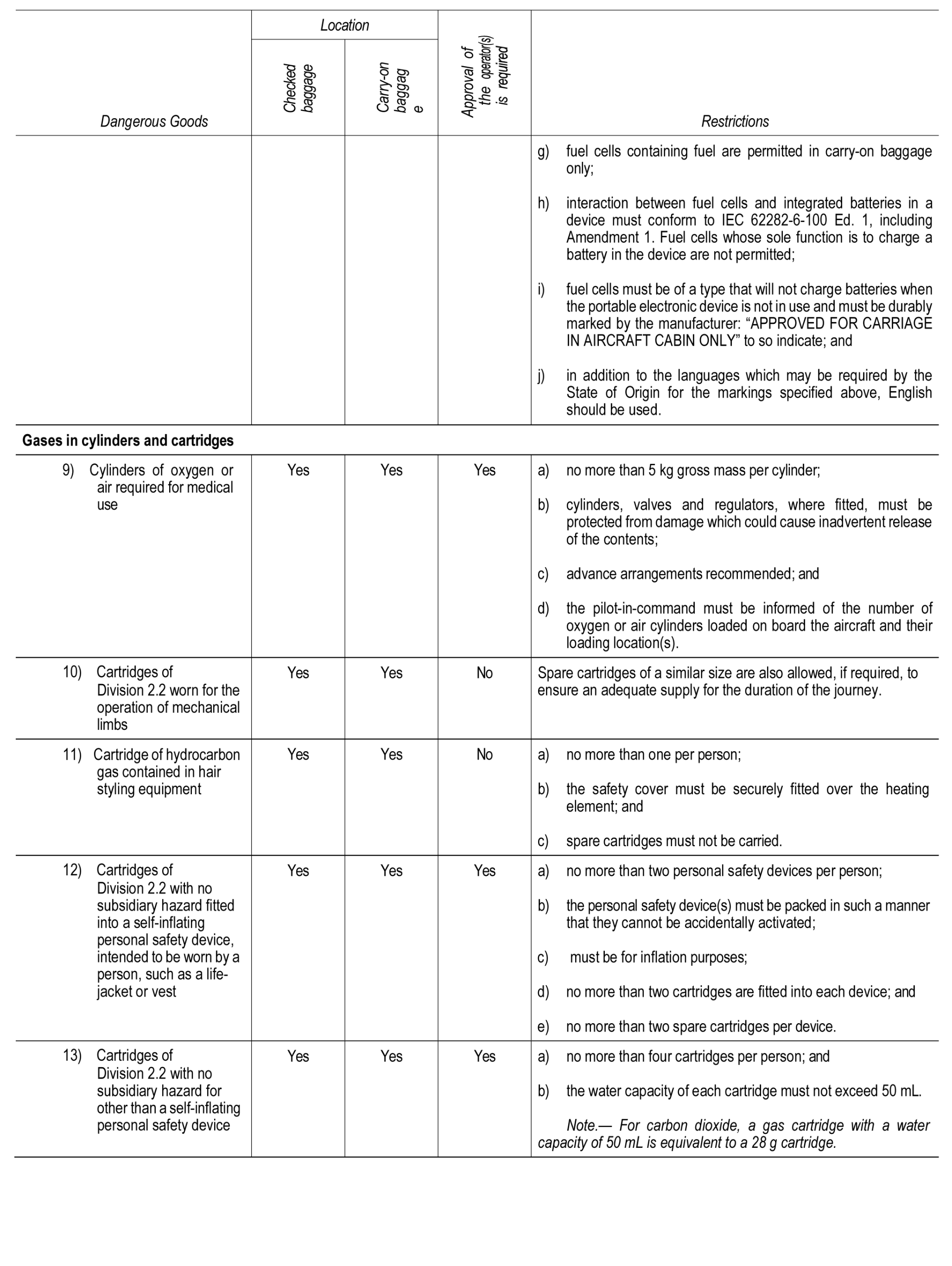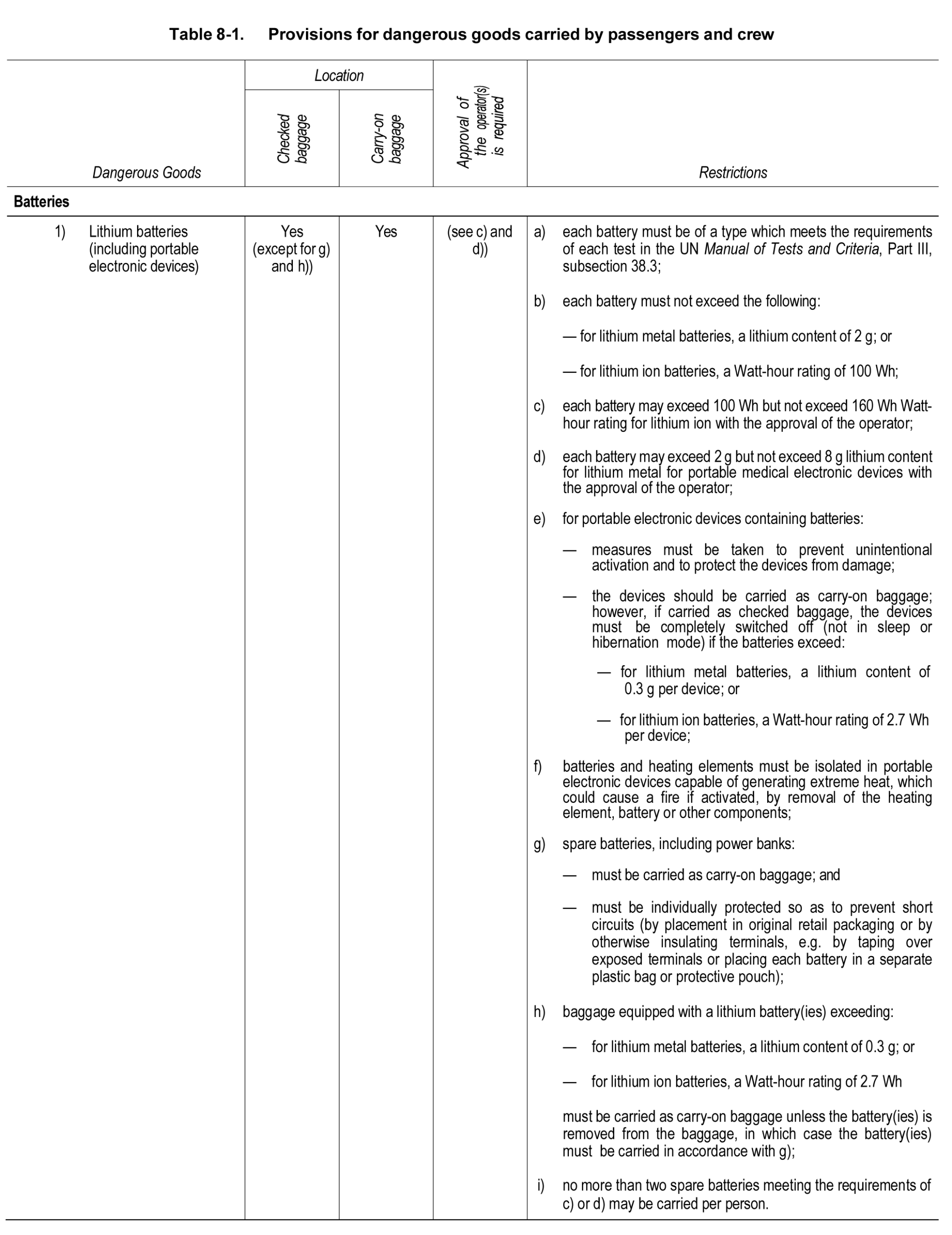 Notwithstanding any additional restrictions that may be implemented by States in the interests of aviation security, passengers or crew are forbidden to carry dangerous goods, either as or in carry-on baggage, checked baggage or on their person, unless the dangerous goods are permitted in accordance with Table 1. “Provisions for DG carried by passengers or crew” and: